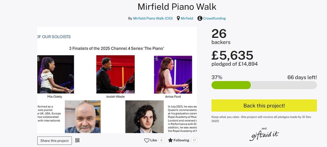 However, this pledge is only paid out if we reach our full target of £14,894. After the first week, we’ve raised £5,635 from 26 donors. This includes £700 from early local sponsorships and £2,760 of in-kind support from Park Pianos—meaning our actual crowdfunding total stands at £2,175. Even with the maximum contribution from Kirklees Council, we still need to raise £4,259.