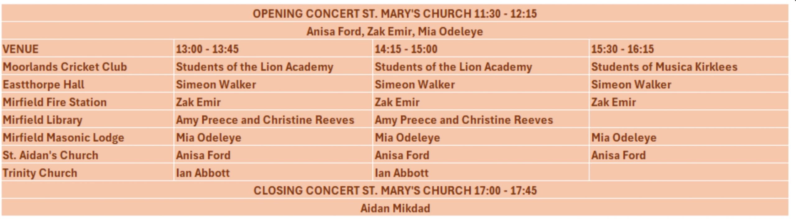 Our concerts will take place in St Mary’s Church and across seven venues along or near Huddersfield Road in the centre of Mirfield. The concert times are listed below.